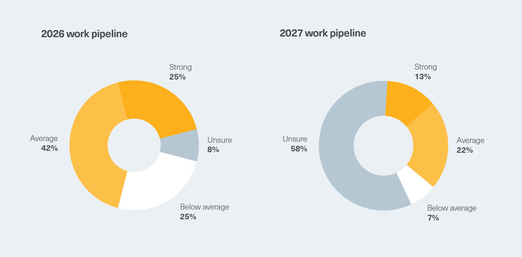 However, confidence is more uncertain when looking further ahead. Nearly 60 percent of respondents said they were unsure about their 2027 pipeline, and only 13 percent described it as strong. Fewer than half were confident that projects currently on hold would proceed.